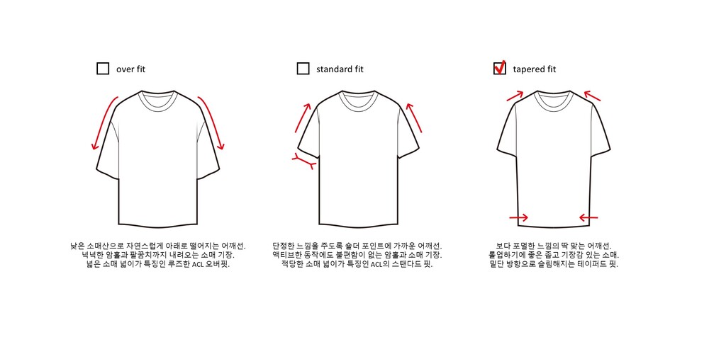 * 슬림한 핏의 테이퍼드 티셔츠입니다. ACL 오버핏 스타일의 착용감을 원하시면 한 치수 크게 주문하세요.
