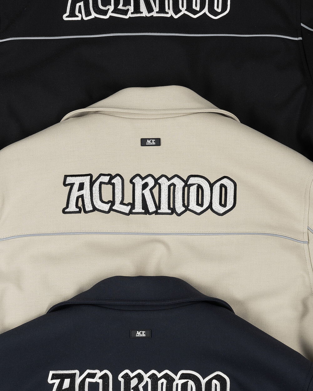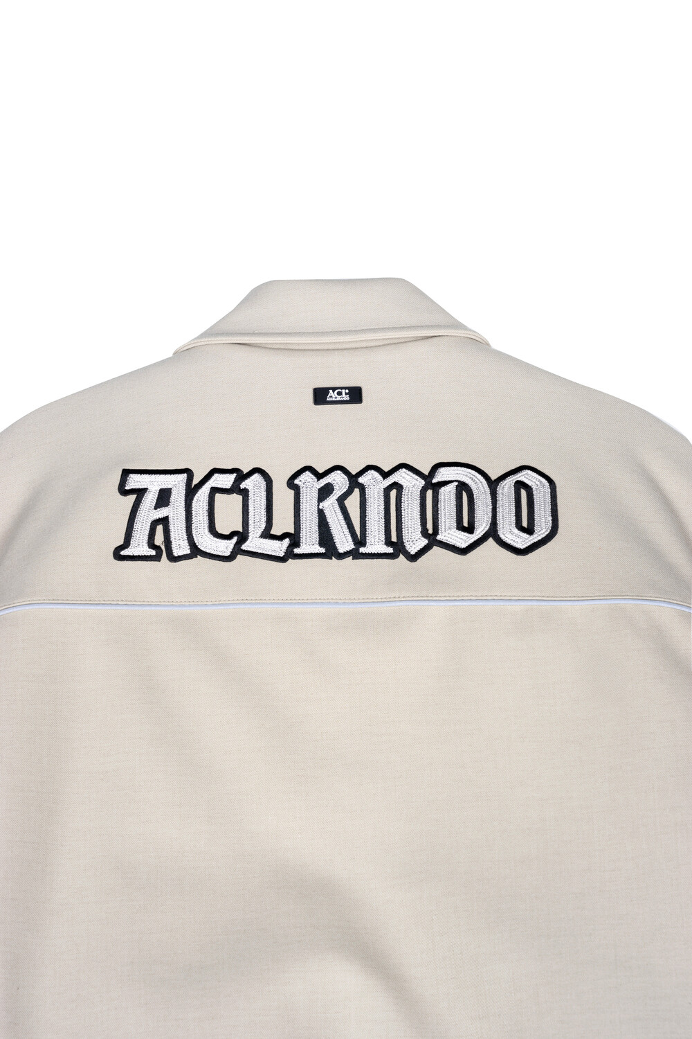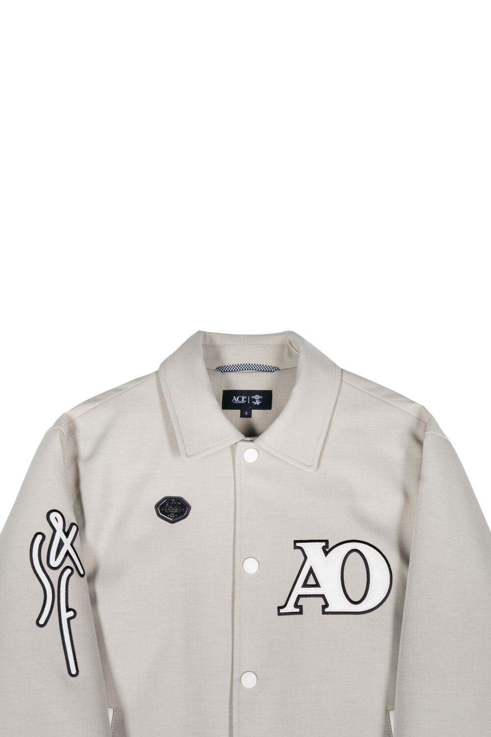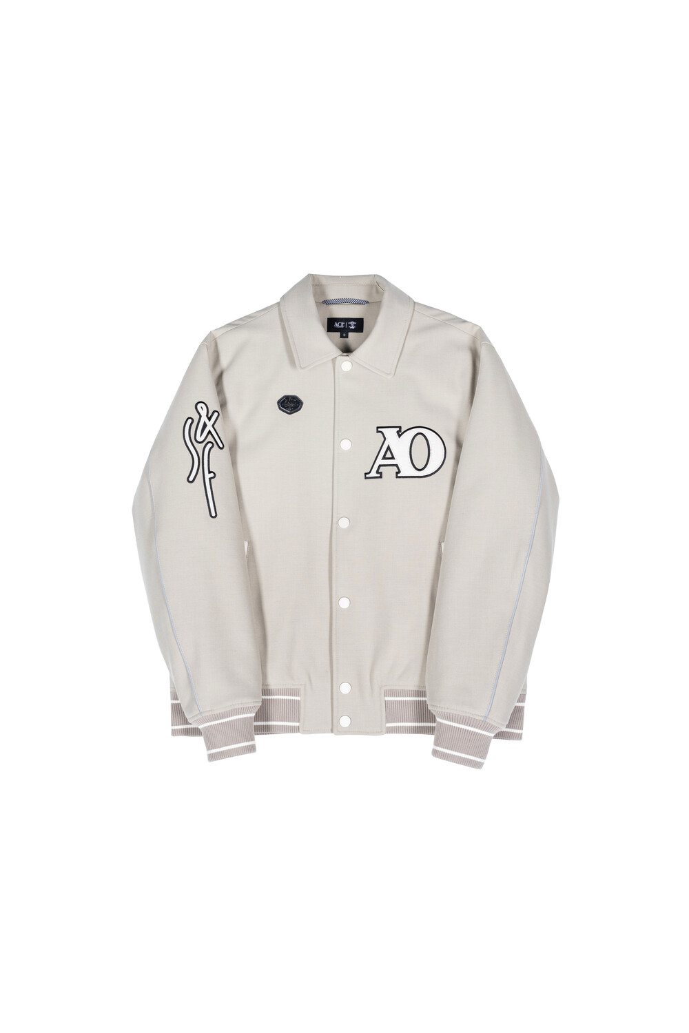 재귀반사 파이핑과 자수, 아플리케 와펜 등의 다양한 디테일이 돋보이는 바시티 유니폼 스타일의 바머 형태 자켓입니다.