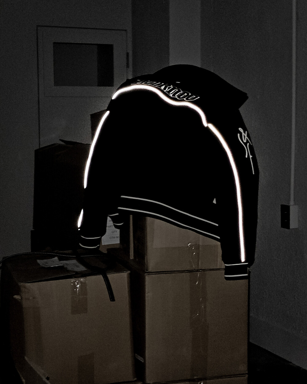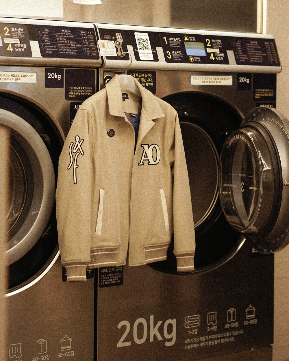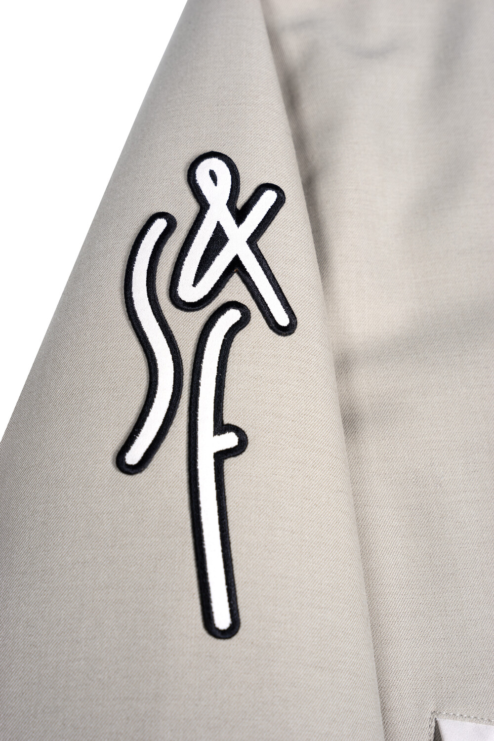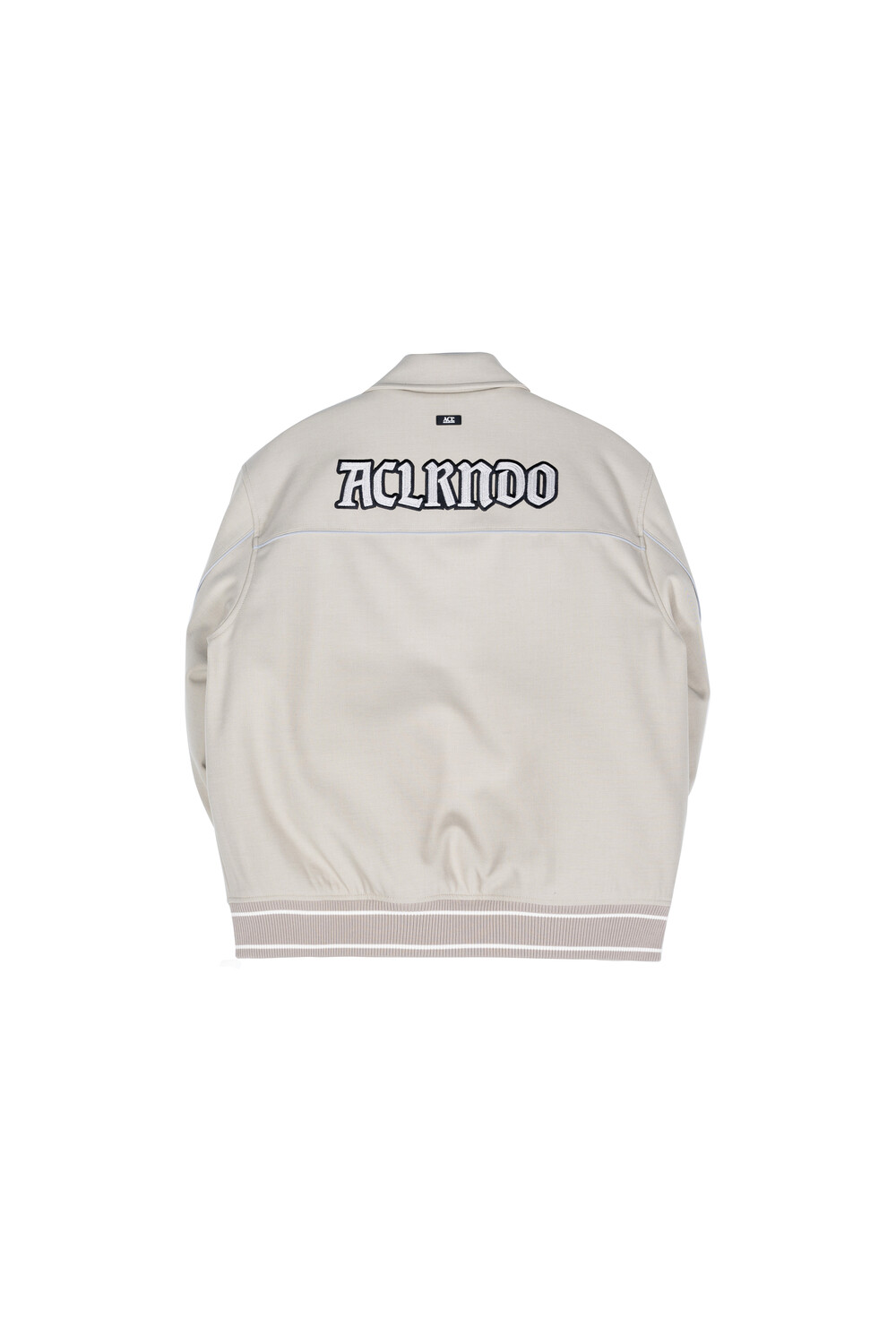 재귀반사 파이핑과 자수, 아플리케 와펜 등의 다양한 디테일이 돋보이는 바시티 유니폼 스타일의 바머 형태 자켓입니다.