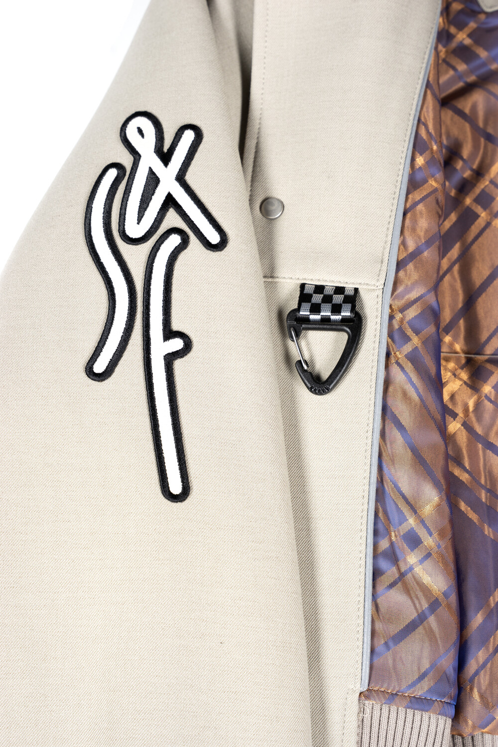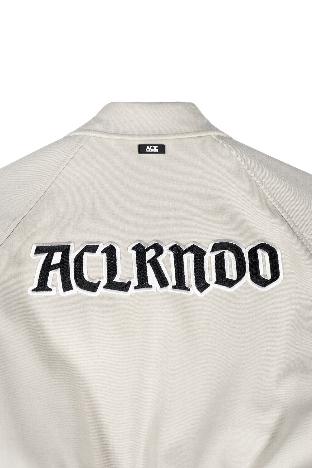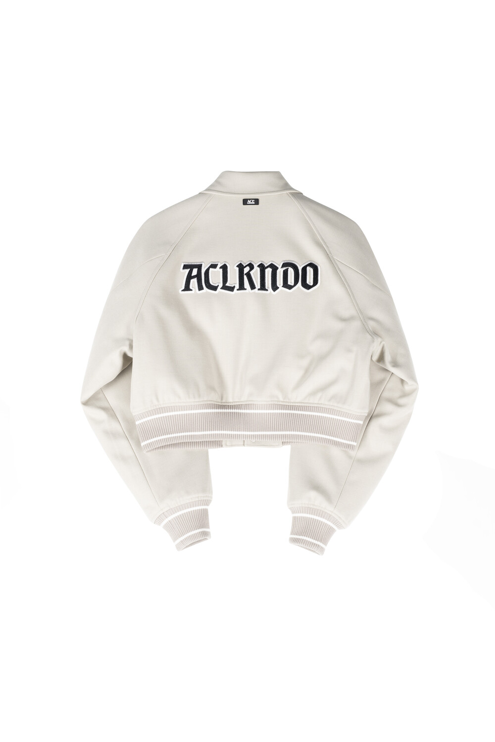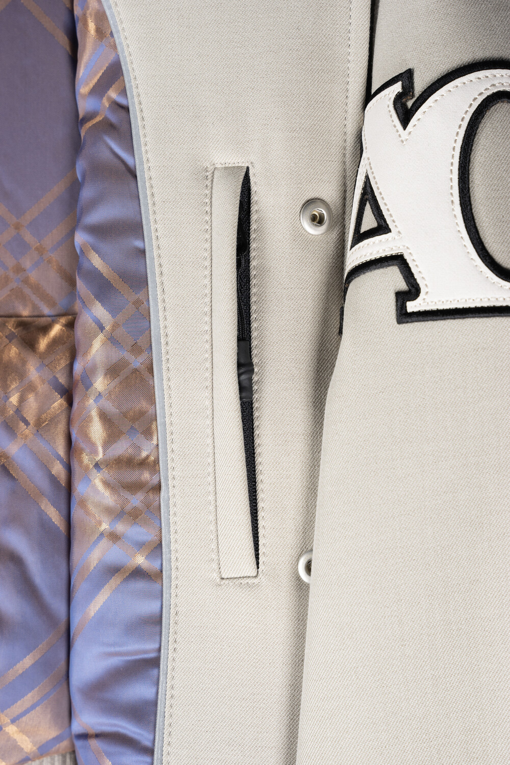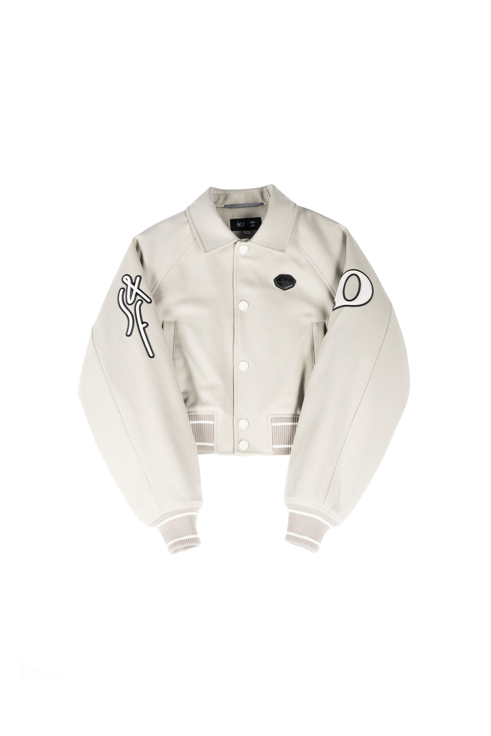 안쪽 재귀반사 파이핑과 자수, 아플리케 와펜 등의 다양한 디테일이 돋보이는 바시티 유니폼 스타일의 크롭 바머 형태 자켓입니다.