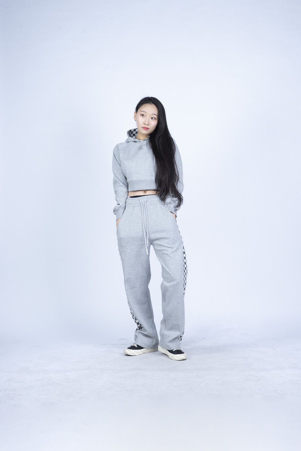 (FB06GY) CHECK POINTED training crop hoodie grey women